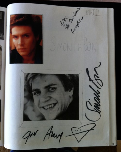 Fast-forward to a time many years later. After spending years apart, pursuing individual projects, Duran Duran reunited. The band offered a special “VIP” event in Las Vegas to kick off their reunion tour. Fans had the chance to meet the band in person at a specially arranged party, and then get up-front seats at their concert. I couldn’t resist, and I brought my trusty Duran Duran scrapbook, which I had kept from my teenage years, so that I could have all the members of the band autograph their sections. (Being the geek that I am, I divided my scrapbook into sections featuring individual photos of each band member, group photos, live photos, etc.)