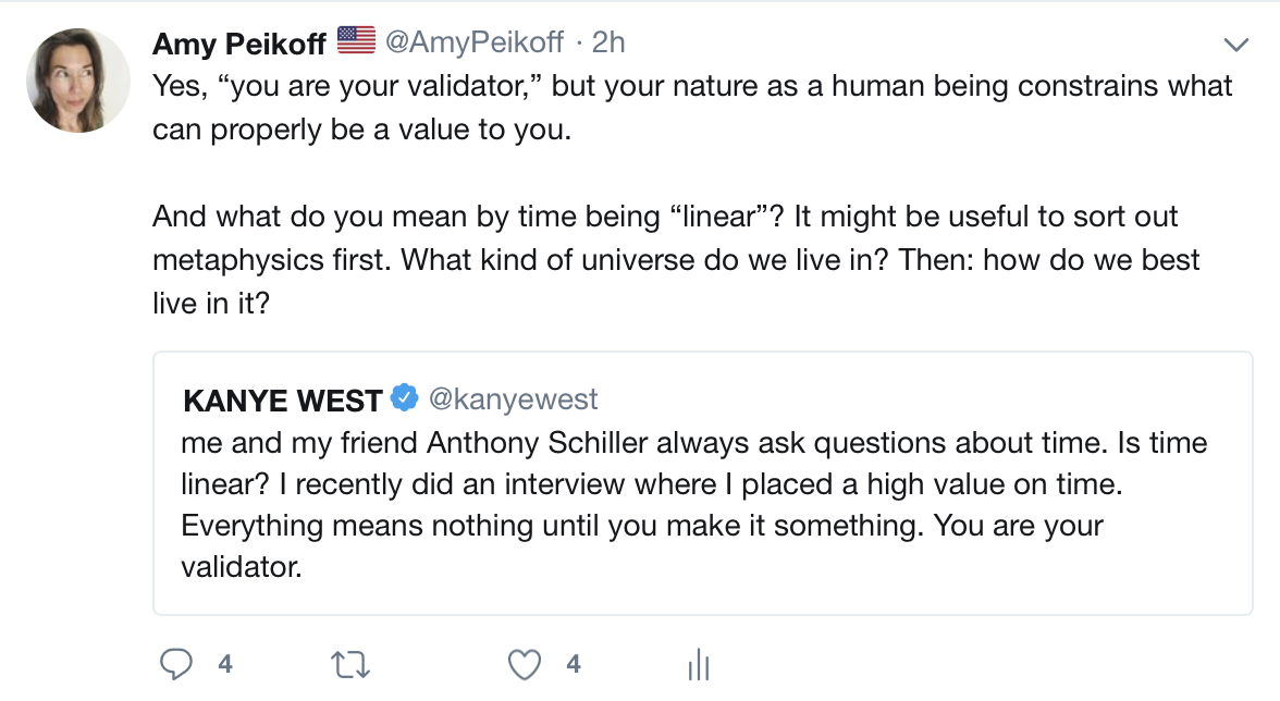 I happened to be on Twitter, and they featured Kanye West, who had just this morning started live tweeting what he’s calling a “book” on philosophy. I responded to several of the tweets; posted a sample here. In some of my responses, I’m more encouraging: after all, here’s someone in the popular culture who’s taking time to think about ideas, and actually sounds somewhat individualistic in some of the tweets. But in others, especially when he starts talking about intellectual property, I’m more critical. Check out my responses on my Twitter feed here.